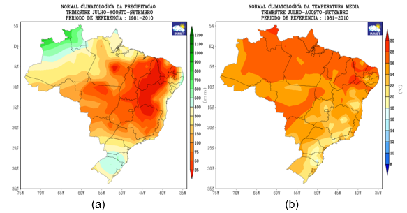 Figura: (a) precipitação e (b) temperatura média do ar para o trimestre julho, agosto e setembro. Fonte: INMET.